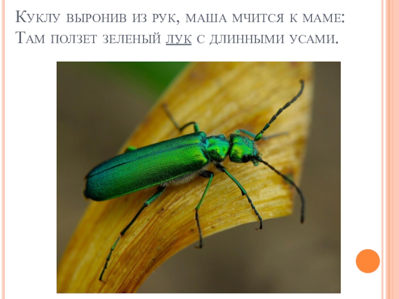 Слайд 8Куклу выронив из рук, маша мчится к маме: Там ползет зеленый лук с длинными