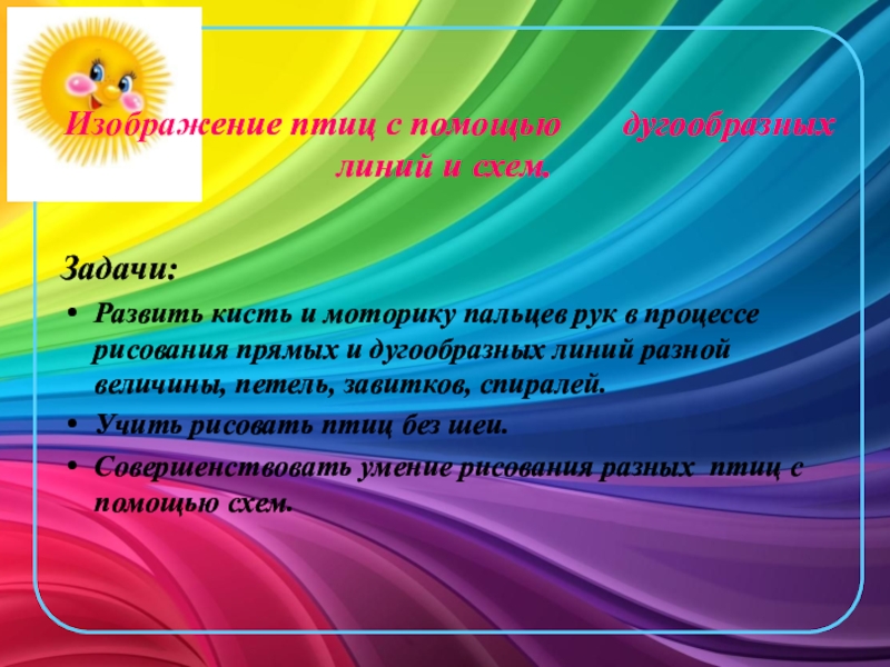 Развить кисть и моторику пальцев рук в процессе рисования прямых и дугообразных линий разной величины, петель, завитков, спиралей.