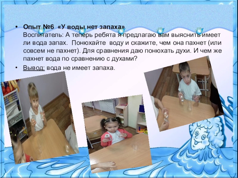 вам выяснить имеет ли вода запах. Понюхайте воду и скажите, чем она пахнет (или совсем не пахнет). Для сравнения даю понюхать духи. И чем же пахнет вода по сравнению с духами?