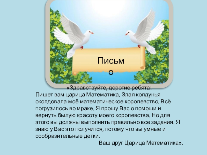 Письмо«Здравствуйте, дорогие ребята! Пишет вам царица Математика. Злая колдунья околдовала моё математическое королевство. Всё погрузилось во мраке. Я прошу Вас о помощи и вернуть былую красоту моего королевства. Но для этого вы должны выполнить правильно все