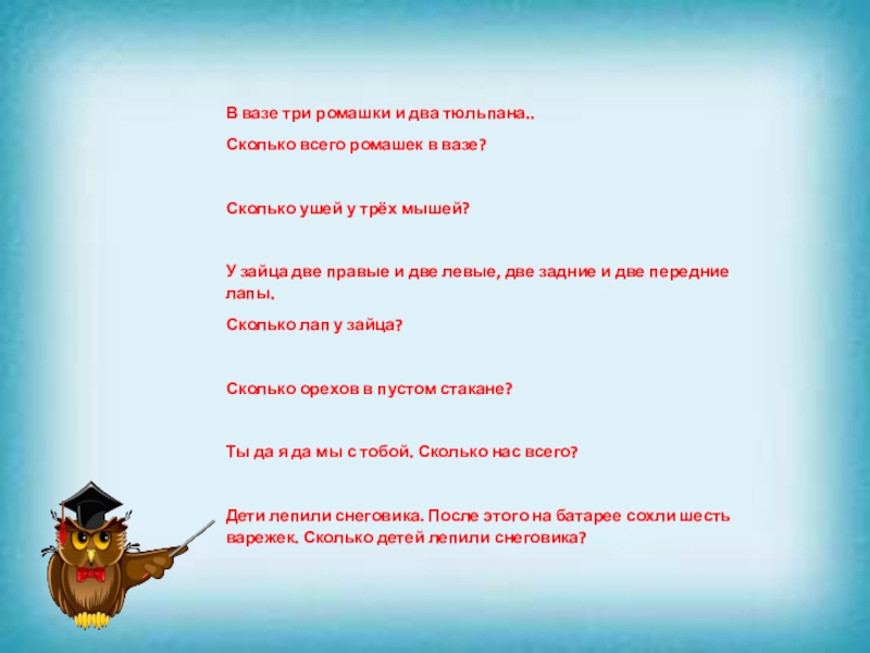 В вазе три ромашки и два тюльпана.. Сколько всего ромашек в вазе? Сколько ушей у трёх мышей? У зайца