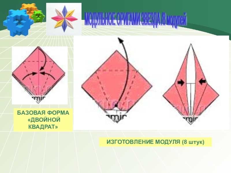 МОДУЛЬНОЕ ОРИГАМИ ЗВЕЗДА /8 модулей БАЗОВАЯ ФОРМА «ДВОЙНОЙ КВАДРАТ»ИЗГОТОВЛЕНИЕ МОДУЛЯ (8 штук)