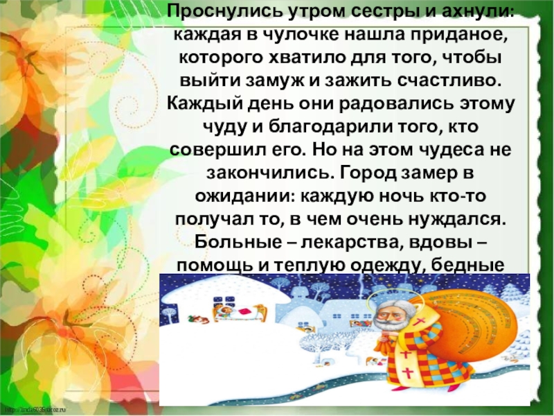 Слайд 10Проснулись утром сестры и ахнули: каждая в чулочке нашла приданое, которого