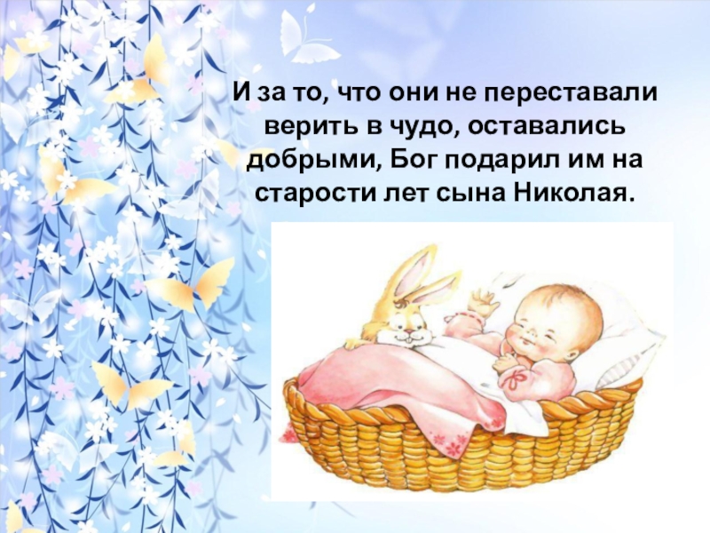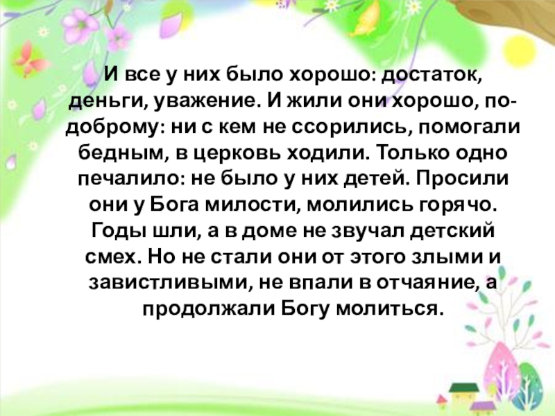 они хорошо, по-доброму: ни с кем не ссорились, помогали бедным, в церковь ходили. Только одно печалило: не было у них детей. Просили они у Бога милости, молились горячо. Годы шли, а в доме не звучал детский смех. Но не стали они от этого злыми и завистливыми, не впали в отчаяние, а продолжали Богу молиться.
