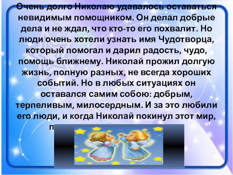и не ждал, что кто-то его похвалит. Но люди очень хотели узнать имя Чудотворца, который помогал и дарил радость, чудо, помощь ближнему. Николай прожил долгую жизнь, полную разных, не всегда хороших событий. Но в любых ситуациях он оставался самим собою: добрым, терпеливым, милосердным. И за это любили его люди, и когда Николай покинул этот мир, причислили его к лику святых