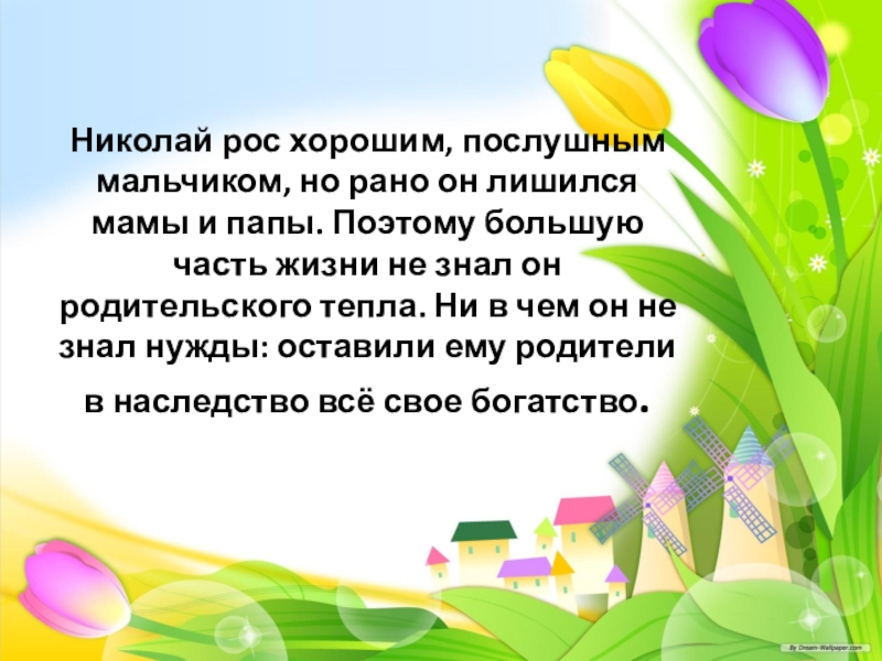 Слайд 5Николай рос хорошим, послушным мальчиком, но рано он лишился мамы и