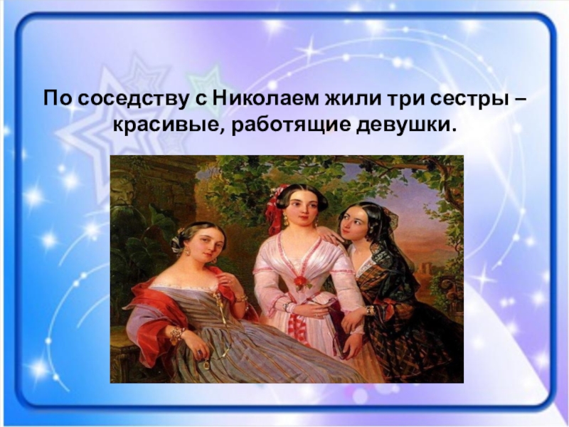 Слайд 6По соседству с Николаем жили три сестры – красивые, работящие девушки.