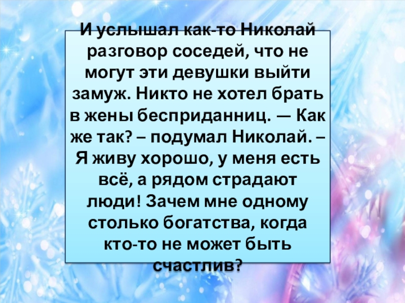 выйти замуж. Никто не хотел брать в жены бесприданниц. — Как же так? – подумал Николай. – Я живу хорошо, у меня есть всё, а рядом страдают люди! Зачем мне одному столько богатства, когда кто-то не может быть счастлив?