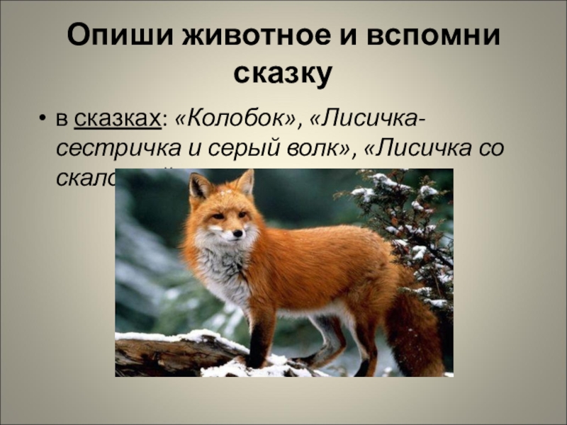 Опиши животное и вспомни сказкув сказках: «Колобок», «Лисичка-сестричка и серый волк», «Лисичка со скалочкой»