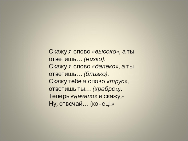 Скажу я слово «высоко», а ты ответишь… (низко).Скажу я слово «далеко», а ты ответишь… (близко).Скажу тебе я