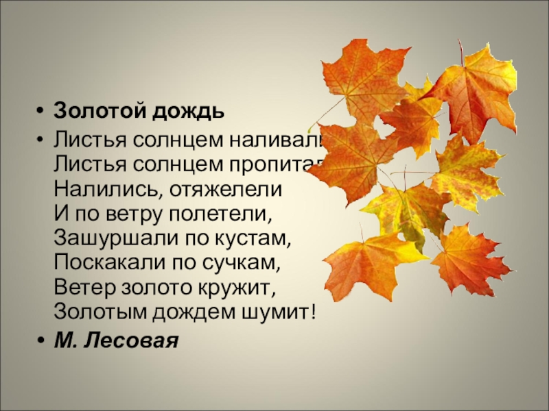 Золотой дождьЛистья солнцем наливались. Листья солнцем пропитались. Налились, отяжелели И по ветру полетели, Зашуршали по кустам, Поскакали