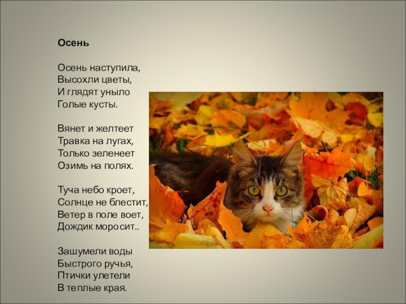 желтеет Травка на лугах, Только зеленеет Озимь на полях. Туча небо кроет, Солнце не блестит, Ветер в поле воет, Дождик моросит.. Зашумели воды Быстрого ручья, Птички улетели В теплые края.