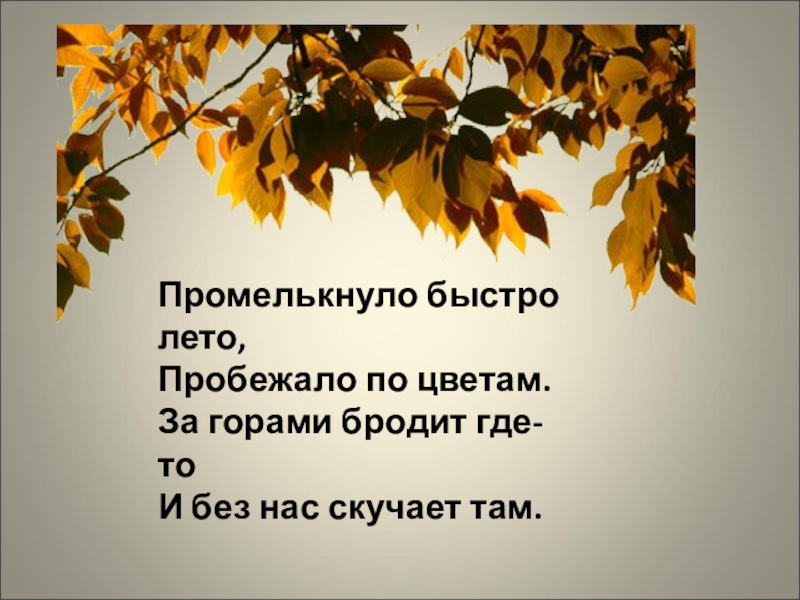 Промелькнуло быстро лето, Пробежало по цветам. За горами бродит где-то И без нас скучает там.