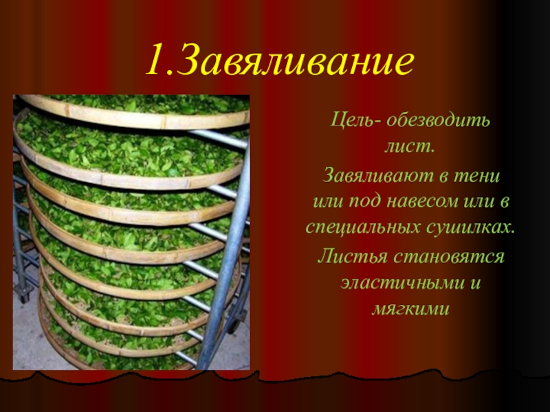 1.Завяливание  Цель- обезводить лист.  Завяливают в тени или под навесом или в специальных сушилках.