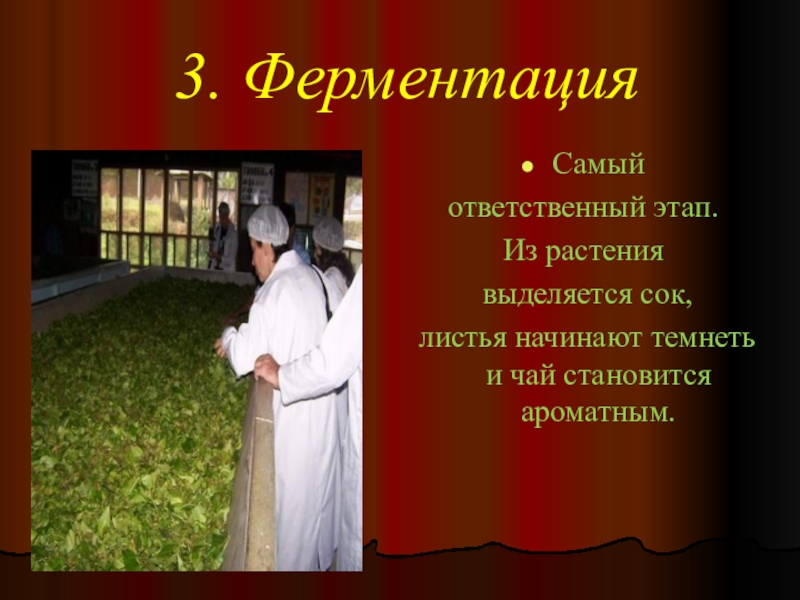 3. ФерментацияСамый ответственный этап. Из растения выделяется сок, листья начинают темнеть и чай становится ароматным.