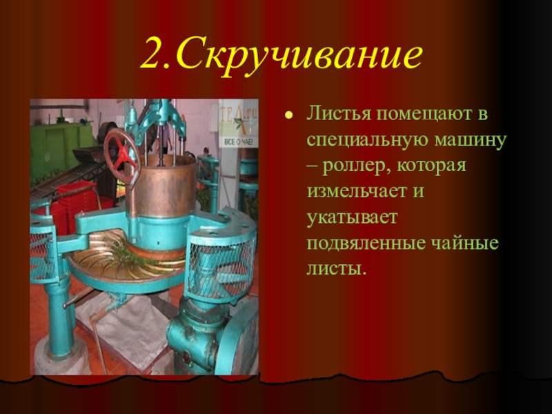 2.СкручиваниеЛистья помещают в специальную машину – роллер, которая измельчает и укатывает подвяленные чайные листы.