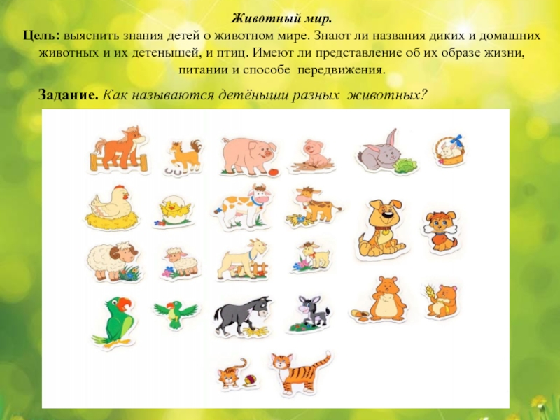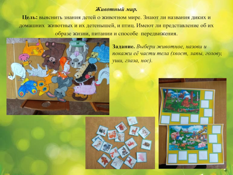Задание. Выбери животное, назови и покажи её части тела (хвост, лапы, голову, уши, глаза, нос).