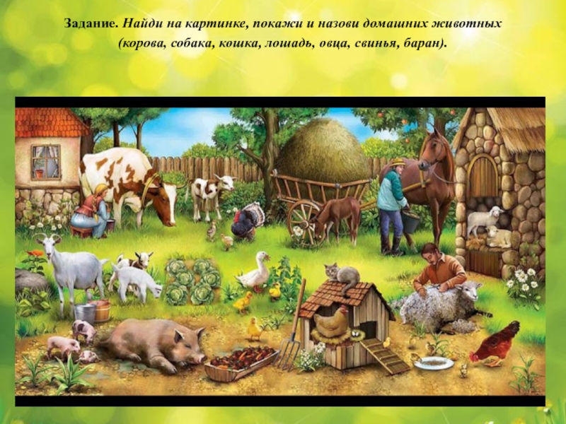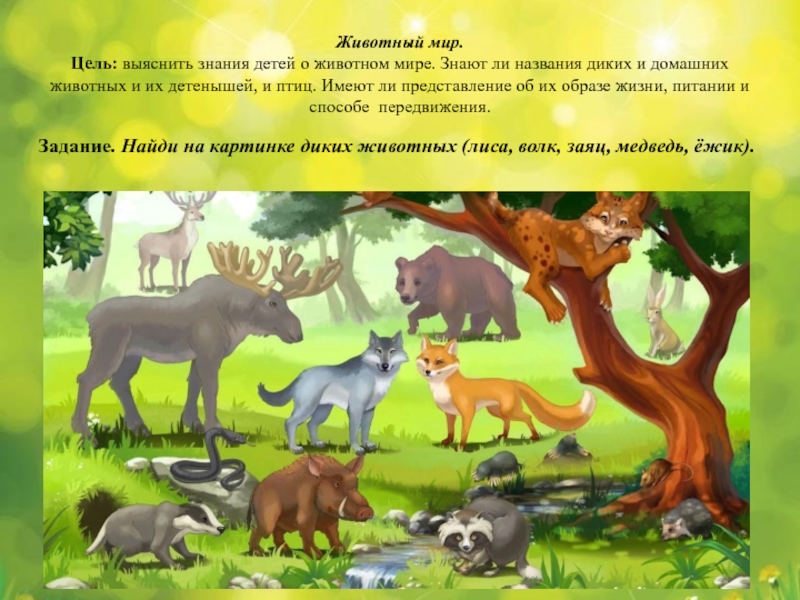 Задание. Найди на картинке диких животных (лиса, волк, заяц, медведь, ёжик).