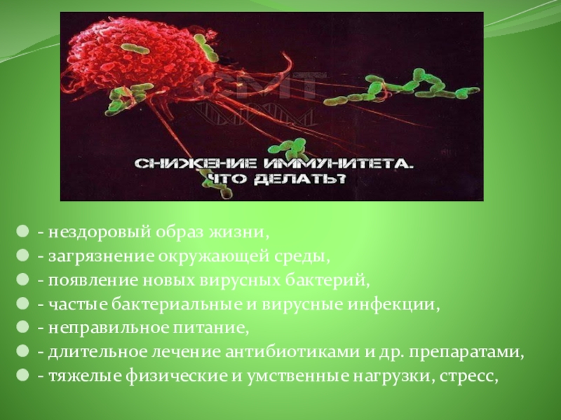 - нездоровый образ жизни, - загрязнение окружающей среды,- появление новых вирусных бактерий,- частые бактериальные и вирусные инфекции,-