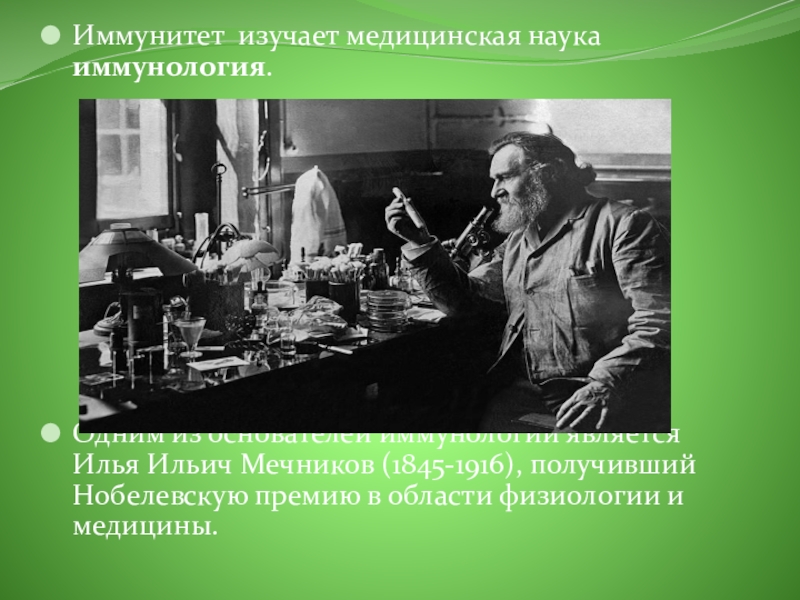 Иммунитет изучает медицинская наука иммунология.Одним из основателей иммунологии является Илья Ильич Мечников (1845-1916), получивший Нобелевскую премию в