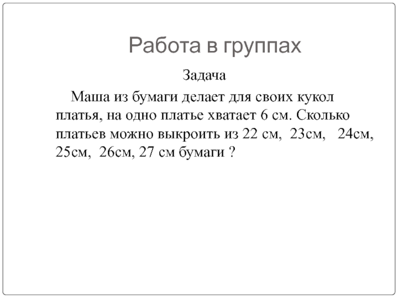 Маша из бумаги делает для своих кукол платья, на одно платье хватает 6 см. Сколько платьев можно выкроить из 22 см, 23см, 24см, 25см, 26см, 27 см бумаги ?