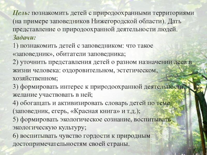 Слайд 4Цель: познакомить детей с природоохранными территориями (на примере заповедников Нижегородской области).