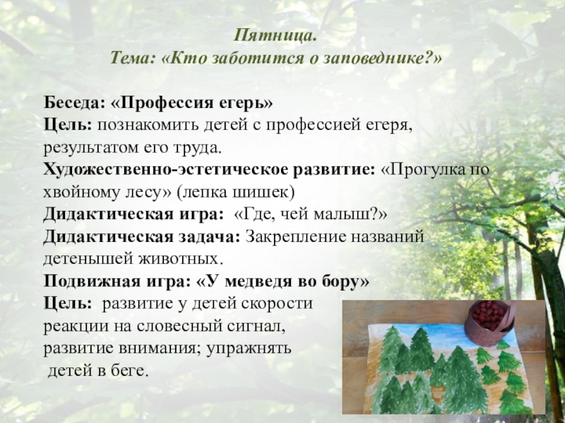2) уточнить представления детей о разном назначении леса в жизни человека: оздоровительном, эстетическом, хозяйственном;