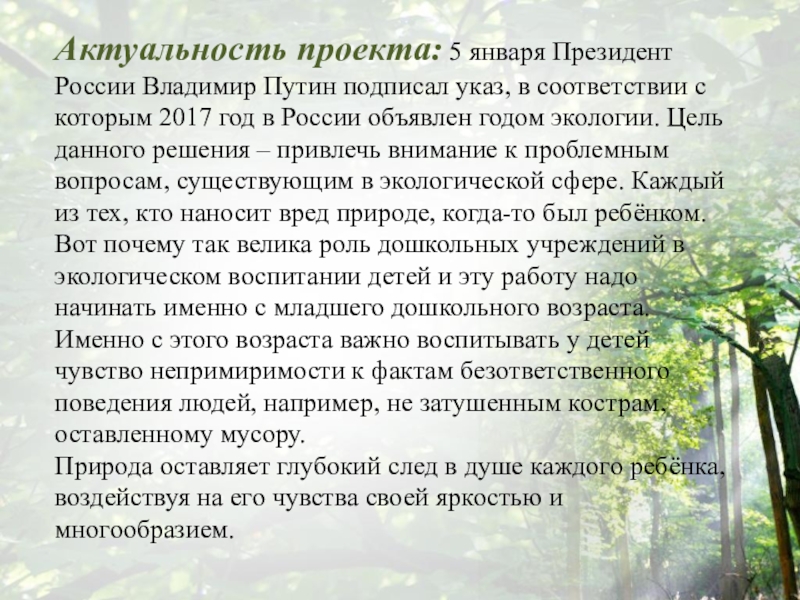с которым 2017 год в России объявлен годом экологии. Цель данного решения – привлечь внимание к проблемным вопросам, существующим в экологической сфере. Каждый из тех, кто наносит вред природе, когда-то был ребёнком. Вот почему так велика роль дошкольных учреждений в экологическом воспитании детей и эту работу надо начинать именно с младшего дошкольного возраста. Именно с этого возраста важно воспитывать у детей чувство непримиримости к фактам безответственного поведения людей, например, не затушенным кострам, оставленному мусору.
