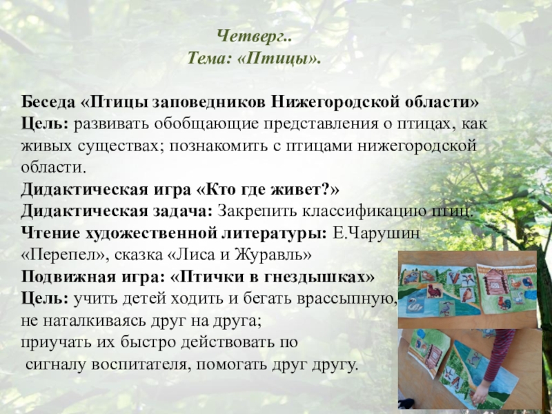 птицах, как живых существах; познакомить с птицами нижегородской области.
