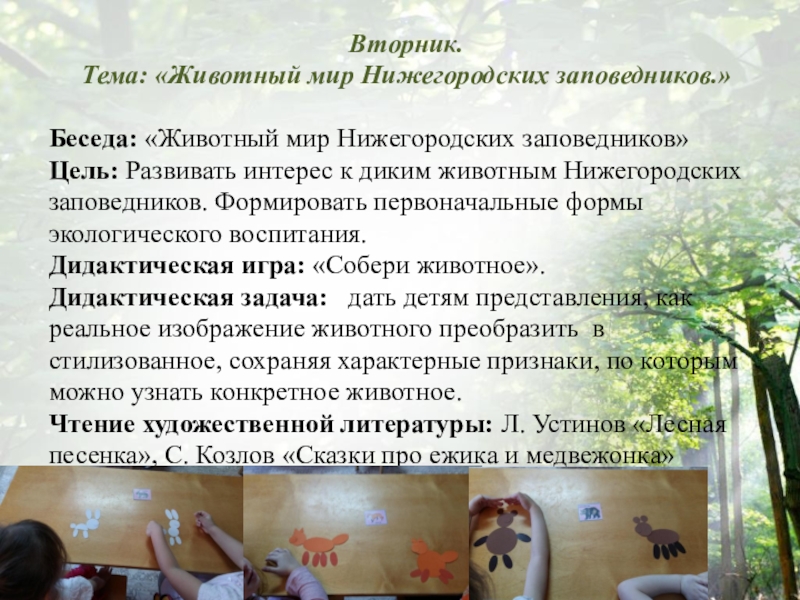 интерес к диким животным Нижегородских заповедников. Формировать первоначальные формы экологического воспитания.