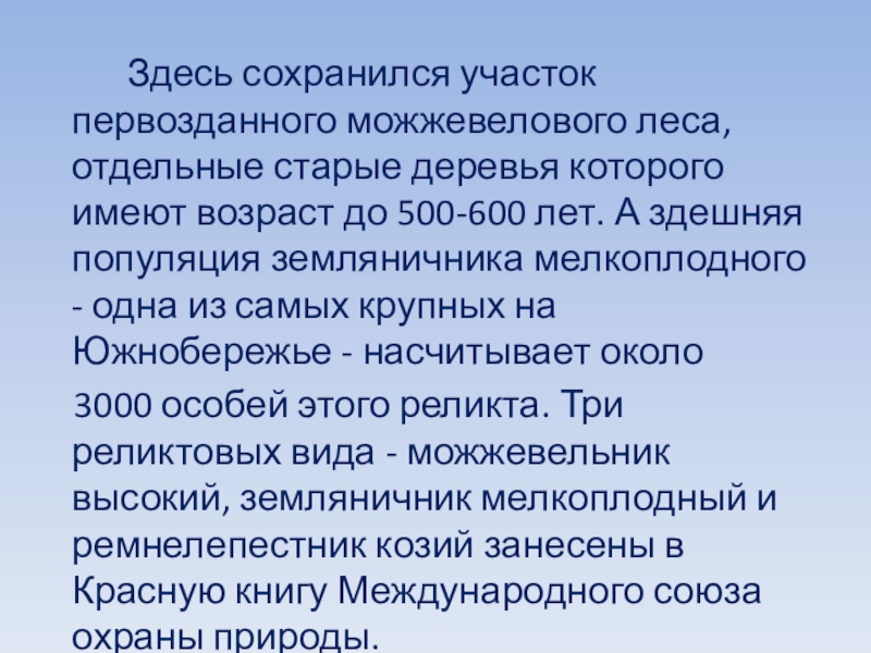 Слайд 23 Здесь сохранился участок первозданного можжевелового леса,