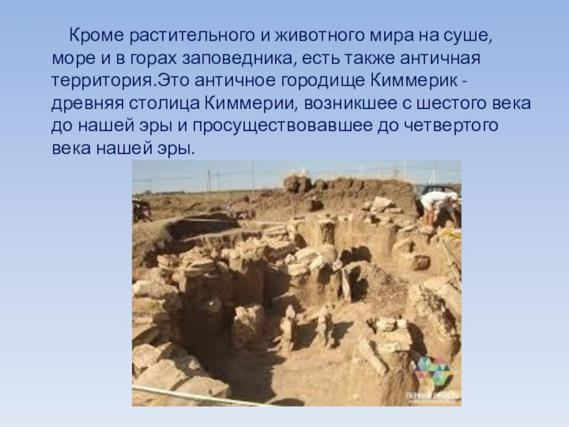 суше, море и в горах заповедника, есть также античная территория.Это античное городище Киммерик - древняя столица Киммерии, возникшее с шестого века до нашей эры и просуществовавшее до четвертого века нашей эры.