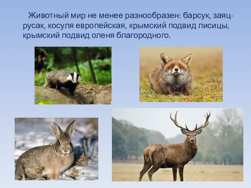 косуля европейская, крымский подвид лисицы, крымский подвид оленя благородного.