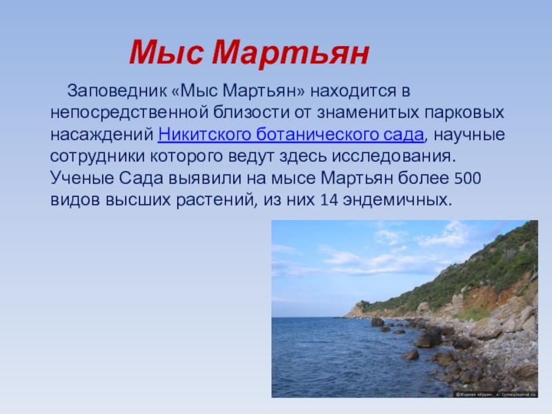 непосредственной близости от знаменитых парковых насаждений Никитского ботанического сада, научные сотрудники которого ведут здесь исследования. Ученые Сада выявили на мысе Мартьян более 500 видов высших растений, из них 14 эндемичных.