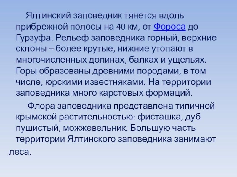 Слайд 31 Ялтинский заповедник тянется вдоль прибрежной полосы