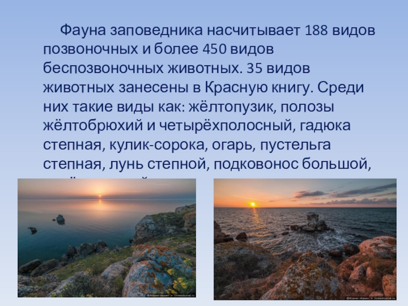 здесь под надежной охраной. Своеобразен и животный мир заповедника: здесь встречается 15 видов млекопитающих, 150 видов птиц; 11 представителей фауны занесены в Красные книги, а крымский геккон и леопардовый полоз - в Международную Красную книгу.