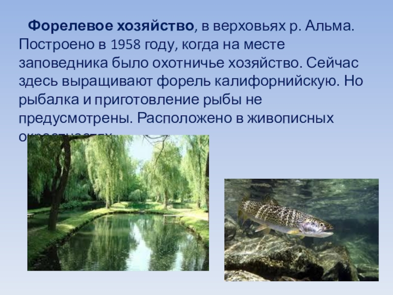 Слайд 21 Форелевое хозяйство, в верховьях р. Альма. Построено в