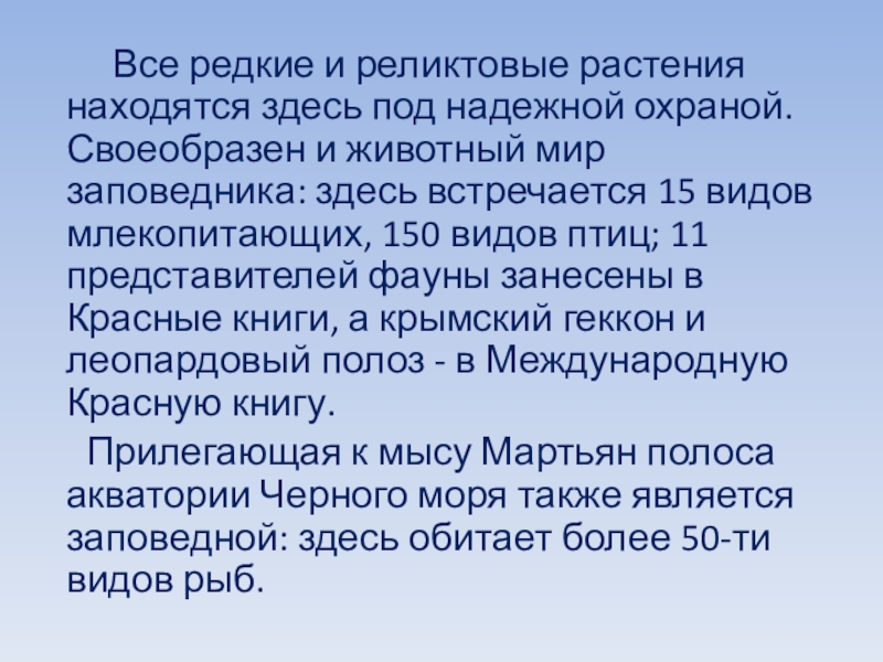 Прилегающая к мысу Мартьян полоса акватории Черного моря также является заповедной: здесь обитает более 50-ти видов рыб.