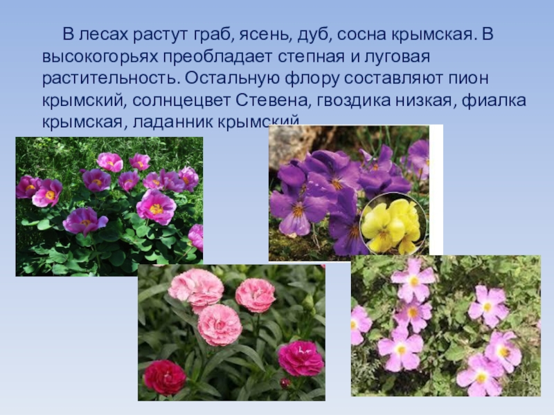 сосна крымская. В высокогорьях преобладает степная и луговая растительность. Остальную флору составляют пион крымский, солнцецвет Стевена, гвоздика низкая, фиалка крымская, ладанник крымский.