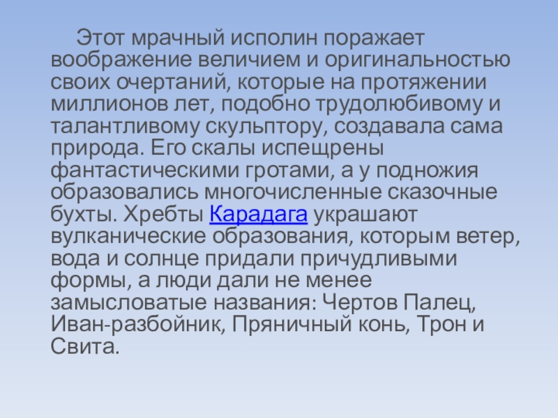и оригинальностью своих очертаний, которые на протяжении миллионов лет, подобно трудолюбивому и талантливому скульптору, создавала сама природа. Его скалы испещрены фантастическими гротами, а у подножия образовались многочисленные сказочные бухты. Хребты Карадага украшают вулканические образования, которым ветер, вода и солнце придали причудливыми формы, а люди дали не менее замысловатые названия: Чертов Палец, Иван-разбойник, Пряничный конь, Трон и Свита.