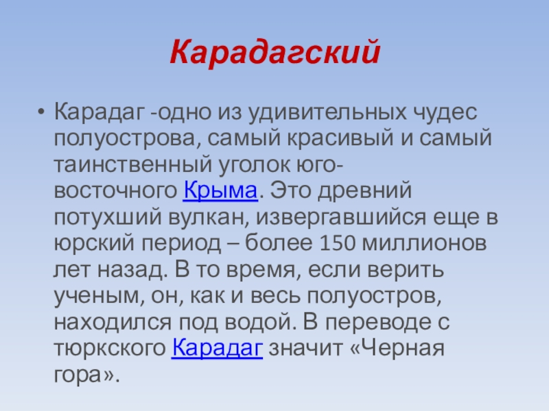 уголок юго-восточного Крыма. Это древний потухший вулкан, извергавшийся еще в юрский период – более 150 миллионов лет назад. В то время, если верить ученым, он, как и весь полуостров, находился под водой. В переводе с тюркского Карадаг значит «Черная гора».