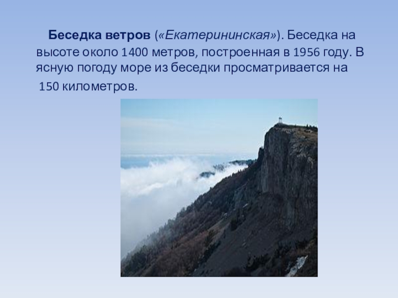 Слайд 17 Беседка ветров («Екатерининская»). Беседка на высоте около 1400 метров, построенная