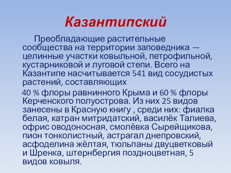 — целинные участки ковыльной, петрофильной, кустарниковой и луговой степи. Всего на Казантипе насчитывается 541 вид сосудистых растений, составляющих