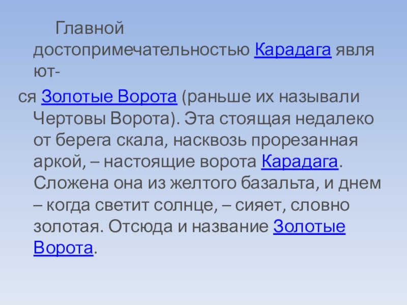 Ворота). Эта стоящая недалеко от берега скала, насквозь прорезанная аркой, – настоящие ворота Карадага. Сложена она из желтого базальта, и днем – когда светит солнце, – сияет, словно золотая. Отсюда и название Золотые Ворота.