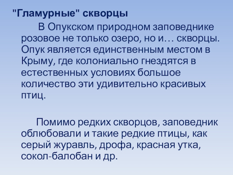 розовое не только озеро, но и… скворцы. Опук является единственным местом в Крыму, где колониально гнездятся в естественных условиях большое количество эти удивительно красивых птиц.