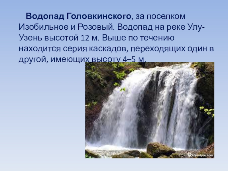 Слайд 20 Водопад Головкинского, за поселком Изобильное и Розовый. Водопад на