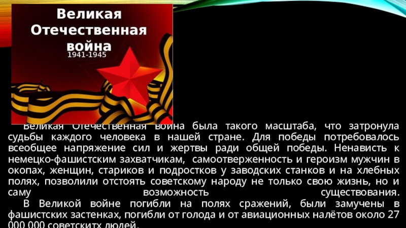 Слайд 20 Великая Отечественная война была такого масштаба, что затронула судьбы каждого человека
