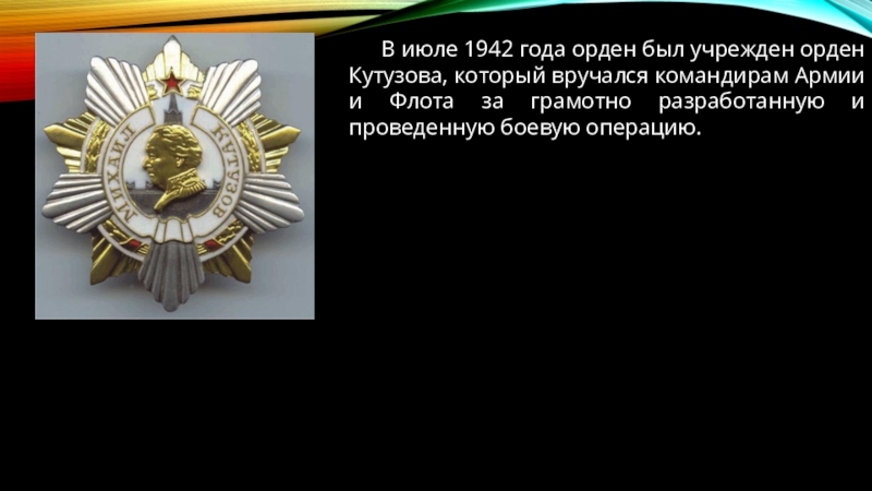 Слайд 17 В июле 1942 года орден был учрежден орден Кутузова, который вручался