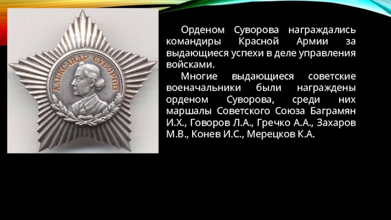Многие выдающиеся советские военачальники были награждены орденом Суворова, среди них маршалы Советского Союза Баграмян И.Х., Говоров Л.А., Гречко А.А., Захаров М.В., Конев И.С., Мерецков К.А.