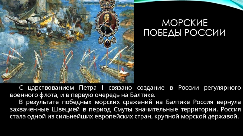 В результате победных морских сражений на Балтике Россия вернула захваченные Швецией в период Смуты значительные территории. Россия стала одной из сильнейших европейских стран, крупной морской державой.